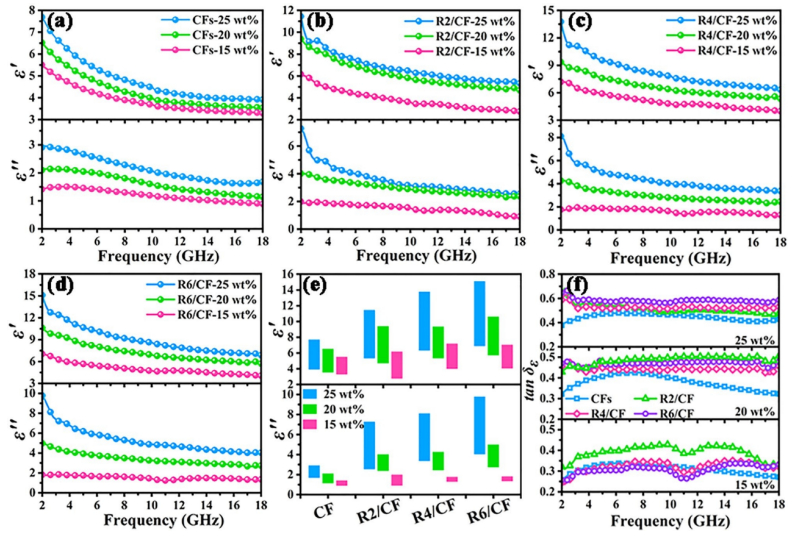 Fig 3. CFs, R2/CF, R4/CF和R6/CF的(a-e)介電參數(shù)以及對比圖,(f)介質(zhì)損耗正切值。