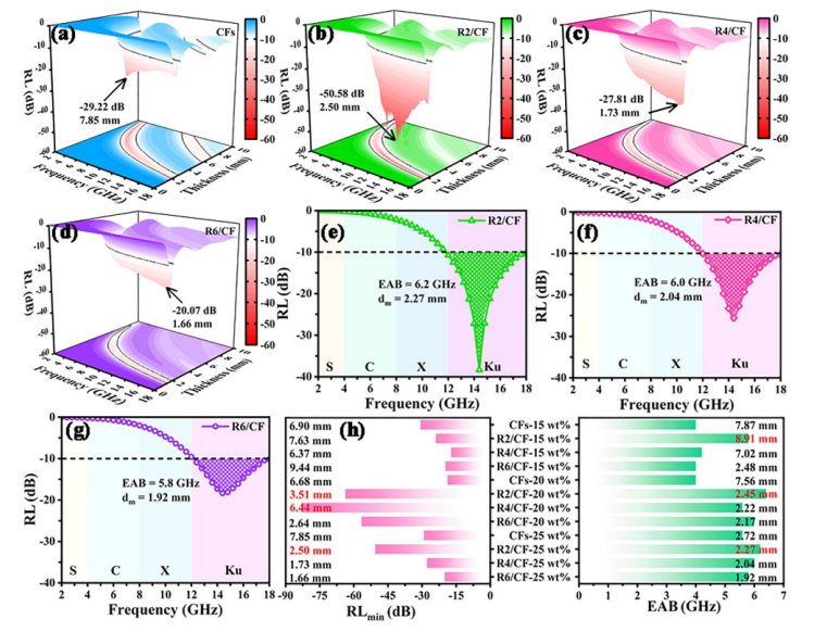 Fig 4. R2/CF, R4/CF和R6/CF在25 wt%下的(a-d)3D RL,(e-g)EAB,(h)各樣品在不同填充比下的RLmin和EAB的對比。
