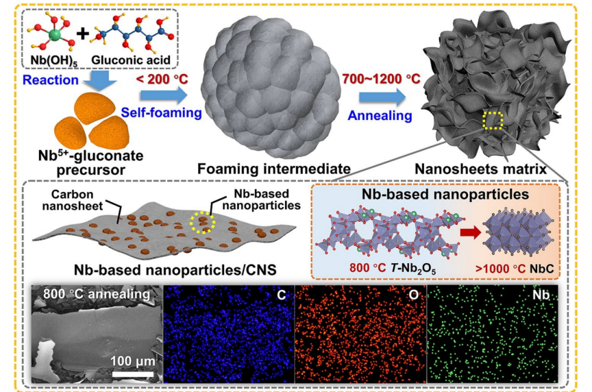 Fig 1. 二維 Nb2O5 和 NbC 納米粒子/碳納米片復(fù)合材料的合成示意圖。