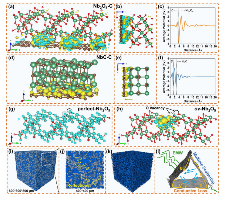 Fig 6. (a-b)Nb?O?−碳構(gòu)型和(d-e)NbC−碳構(gòu)型的電荷密度分布;(c)Nb?O?−碳構(gòu)型和(f)NbC−碳構(gòu)型的平面平均靜電勢(shì);(g)完美Nb?O?晶體的電荷密度分布和(h)ov-Nb?O?的電荷密度分布(黃色和藍(lán)色區(qū)域代表電子的聚集和離散);(i-k)ov-Nb?O?/CNS−石蠟吸波體的CT三維重建圖像(深藍(lán)和灰色區(qū)域分別為ov-Nb?O?/CNS相和石蠟相);(l)二維片狀ov-Nb?O?/CNS的多重散射和導(dǎo)電損耗機(jī)理示意圖。