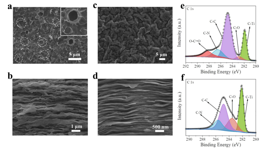 Fig 2. a p-MC 薄膜的頂視圖和 b 截面掃描電子顯微鏡圖像。 c 純 MXene 薄膜的頂視圖和 d 截面掃描電子顯微鏡圖像。e p-MC 和 f 純 MXene 薄膜的 C 1s XPS 光譜。