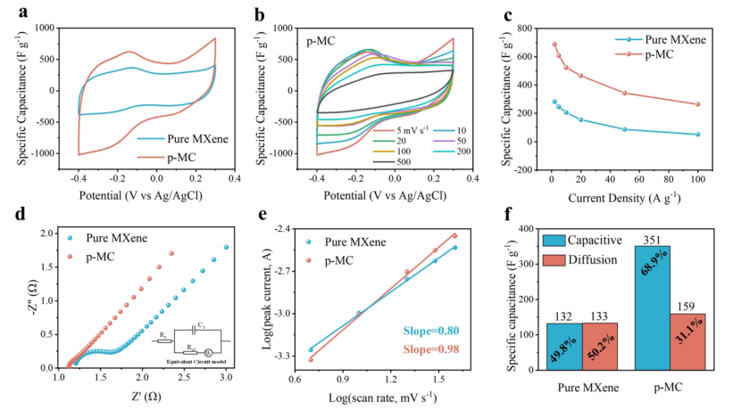 -1 時的 CV 曲線 c 純 MXene 和 p-MC 薄膜的重力電容與電流密度的關(guān)系 d 純 MXene 和 p-MC 薄膜的奈奎斯特曲線 e 對數(shù)(陽極峰值電流)與對數(shù)(掃描速率)的關(guān)系 f 新 MXene 和 p-MC 薄膜的電容貢獻率比較d 純 MXene 和對 MC 薄膜的奈奎斯特圖。 e 對數(shù)(陽極峰值電流)與對數(shù)(掃描速率)的關(guān)系圖。 f 在 5 mV s.