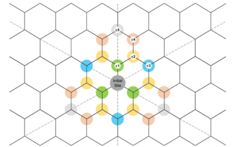 圖1. 氧化官能團(tuán)在氧化石墨烯上的不同分布位點(diǎn)。中間的灰色圓盤表示與原始氧化官能團(tuán)結(jié)合的初始位點(diǎn),其他不同距離和相對(duì)位置的位點(diǎn)用不同顏色和數(shù)字標(biāo)記的圓盤來區(qū)分。