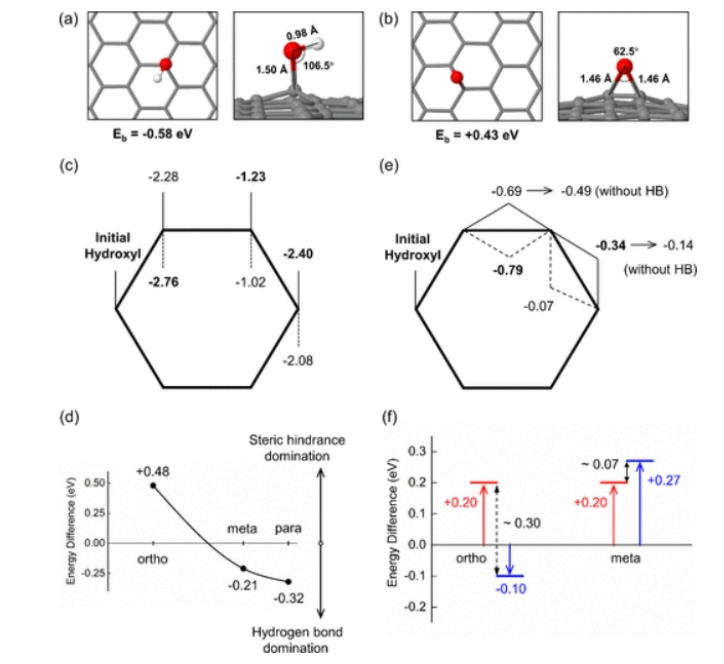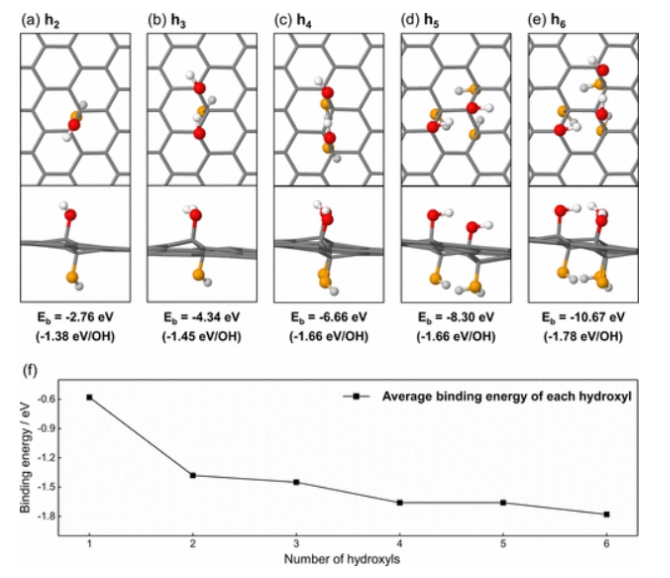 6最穩(wěn)定結(jié)構(gòu)中每個(gè)羥基的平均結(jié)合能。紅色球代表氧化石墨烯平面上方的氧原子,白色球代表氧化石墨烯平面上方的氫原子,橙色球代表氧化石墨烯平面下方的氧原子,淺灰色球代表氧化石墨烯平面下方的氫原子。