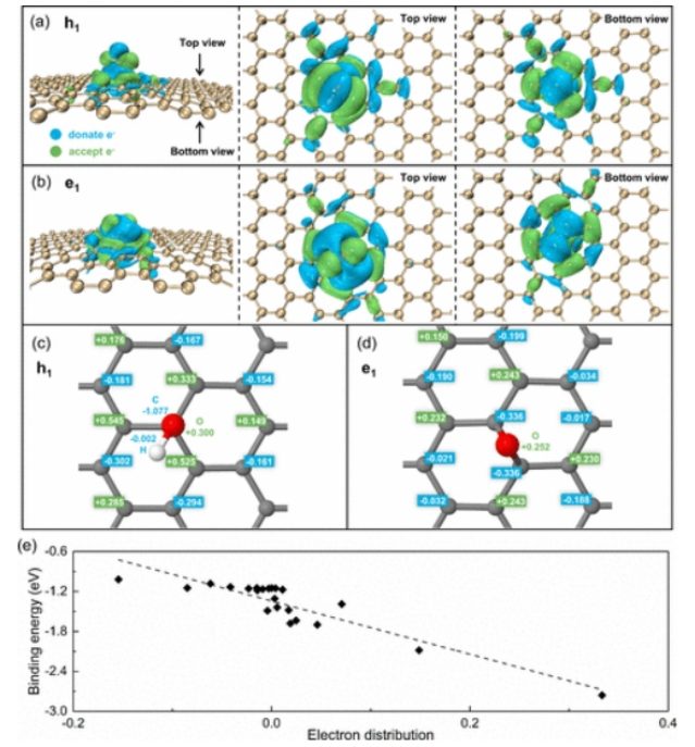 1的電荷分析,其中正值表示接受電子,負(fù)值表示給予電子。(e)氧化石墨烯表面h