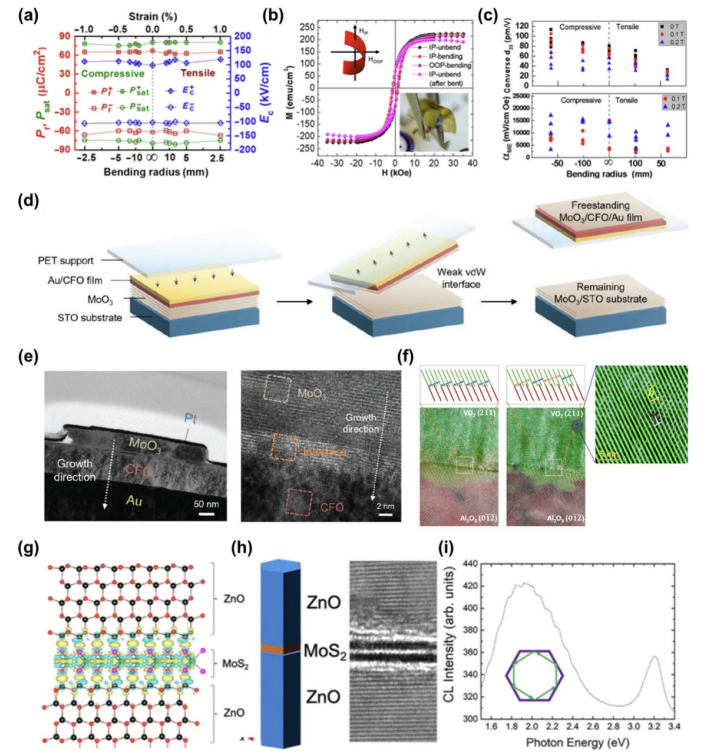3/石墨烯垂直裝置示意圖。(g)SRO/STO襯底上生長(zhǎng)的PMN-PT薄膜(左)、剝落的獨(dú)立PMN-PT膜(右上)和PMN-PT膜剝落后剩余的SRO/STO襯底的照片(右下)。比例尺,2 mm.(h)使用Ti(30 nm)/Ni(3μm)金屬應(yīng)力源層的剝落PMN-PT膜的橫截面透射電子顯微鏡(TEM)圖像。(i) 2ML石墨烯輔助外延層轉(zhuǎn)移:剝離100 nm厚STO(左)、CFO(中)和YIG(右)膜的示意圖(左)、照片(右上)和電子背散射衍射圖(右下)。
