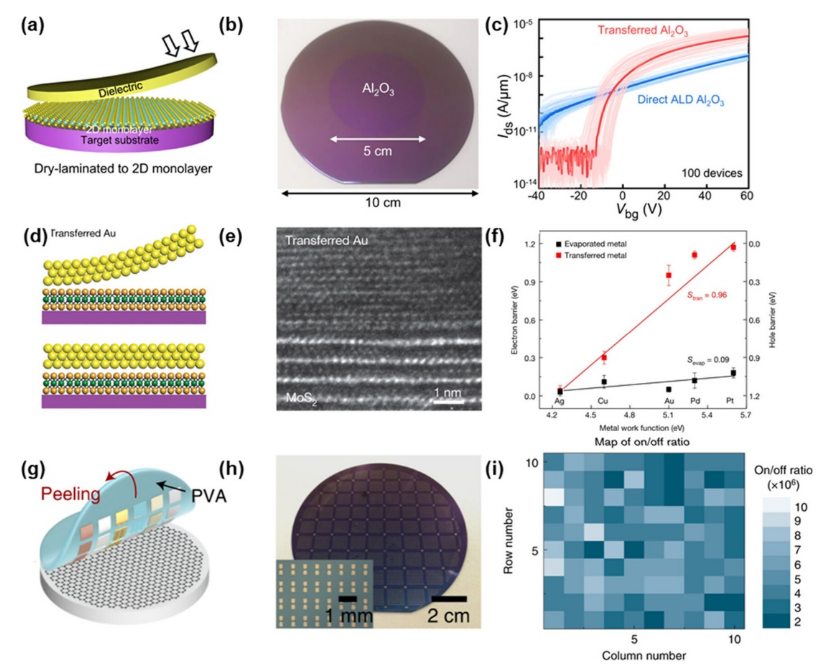 2頂部轉(zhuǎn)移的Au電極的橫截面示意圖和TEM圖像,具有原子銳利和干凈的金屬-半導(dǎo)體界面。(f) 不同金屬功函數(shù)的金屬-半導(dǎo)體結(jié)的肖特基勢(shì)壘高度。(g) 石墨烯輔助金屬轉(zhuǎn)移印花工藝示意圖。(h) 金圖案轉(zhuǎn)移到4英寸SiO