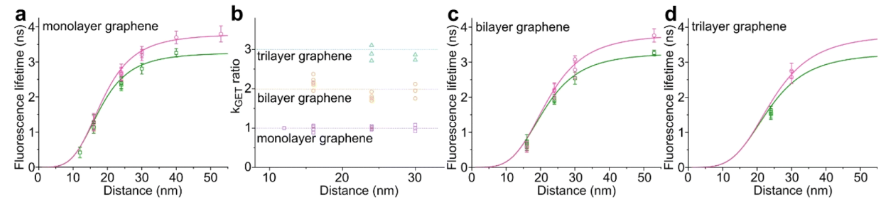 圖2. DNA折紙納米結(jié)構(gòu)中共定位染料分子熒光壽命測(cè)量的平均值和標(biāo)準(zhǔn)偏差。研究了ATOT542(綠色)和ATOT647N(品紅)與距離的函數(shù)關(guān)系:(a)單層,(c)雙層和(d)三層石墨烯。(b) 多層石墨烯與單層石墨烯的能量轉(zhuǎn)移率之比作為距離的函數(shù)。綠色(ATTO542)和品紅(ATTO647N)曲線(a、c和d),作為石墨烯和發(fā)射極之間距離d的函數(shù),其中d