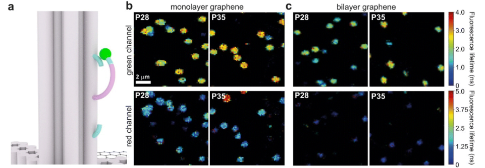 圖3. (a) 包含在柱狀DNA折紙納米結(jié)構(gòu)中的動(dòng)態(tài)分析圖,其中ssDNA指針P35(紫色+綠松石色)的標(biāo)記位置位于距底物表面35 nm的高度處,標(biāo)記有染料分子Cy3B(綠色球體),通過(guò)7個(gè)核苷酸與位于指針上方和下方7 nm處的兩個(gè)結(jié)合位點(diǎn)(綠松石色)互補(bǔ)。在固定于(b)單層和(c)雙層石墨烯上的DNA折紙納米結(jié)構(gòu)中,獲得位于28 nm(P28)或35 nm(P35)高度、用染料Cy3B(綠色通道,上面板)標(biāo)記的指針的(b和c)示例熒光壽命強(qiáng)度圖(10×10μm)。在所有結(jié)構(gòu)中,位于16 nm高度(圖上未標(biāo)記)的ATO647N用作內(nèi)部參考,以監(jiān)測(cè)石墨烯的質(zhì)量(紅色通道,下部面板)。