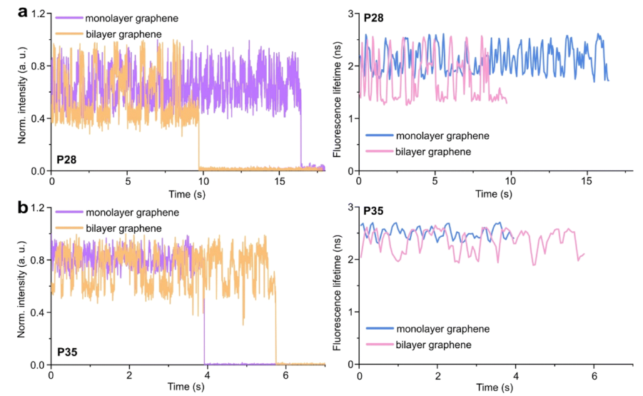 圖4. 定位在28 nm–P28(a)和35 nm–P35(b)高度處的指針?lè)治觯╯sDNA)獲得的測(cè)量熒光強(qiáng)度(紫色和橙色)和相應(yīng)熒光壽命(藍(lán)色和粉色)時(shí)間痕跡示例,用染料分子Cy3B標(biāo)記,并入固定在單層(紫色→藍(lán)色)和雙層(橙色→粉色)石墨烯上的柱狀DNA折紙納米結(jié)構(gòu)中。