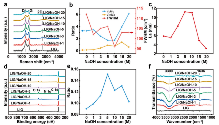 Fig 2. 用不同濃度的 NaOH 溶液處理的各種 LIG 樣品的特性。(a) 拉曼光譜,圖中標出了 D 峰、G 峰和 2D 峰。(b) 根據(jù)圖(a)中的數(shù)據(jù)計算出的 ID/IG、I2D/IG 和 FWHM。(c) 樣品沿 a 軸(La)的晶體尺寸。(d) 不同濃度產(chǎn)品的 XPS 勘測光譜。(e) 圖(d)中不同樣品的 O/C 比。(f) 傅立葉變換紅外光譜。