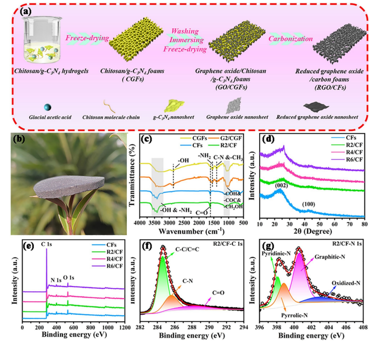 Fig 1. (a) 2D/3D GO/CGFs和RGO/CFs范德華異質(zhì)結(jié)構(gòu)的實驗示意圖,(b)立在葉片上的 R2/CF 的數(shù)字圖像,CFs 和 RGO/CFs (c)傅里葉變換紅外光譜,(d) X射線衍射圖案,(e)X射線光電子能譜,(f,g)R2/CF的 C1s和N1s X射線光電子能譜。
