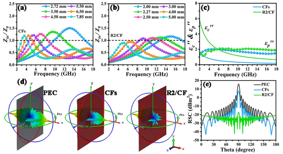 Fig 7. a-c CFs 和 R2/CF 的阻抗-f 曲線、 εc′′, εp′′ 值,以及 d、e PEC、CFs 和 R2/CF 的 3D RCS 仿真和 0-180° 入射角時的模擬 RCS 值