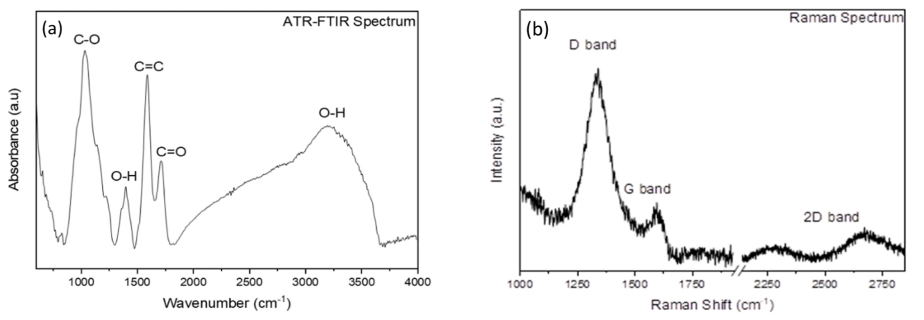圖2. (a)氧化石墨烯的ATR-FTIR譜。(b)氧化石墨烯的拉曼光譜。