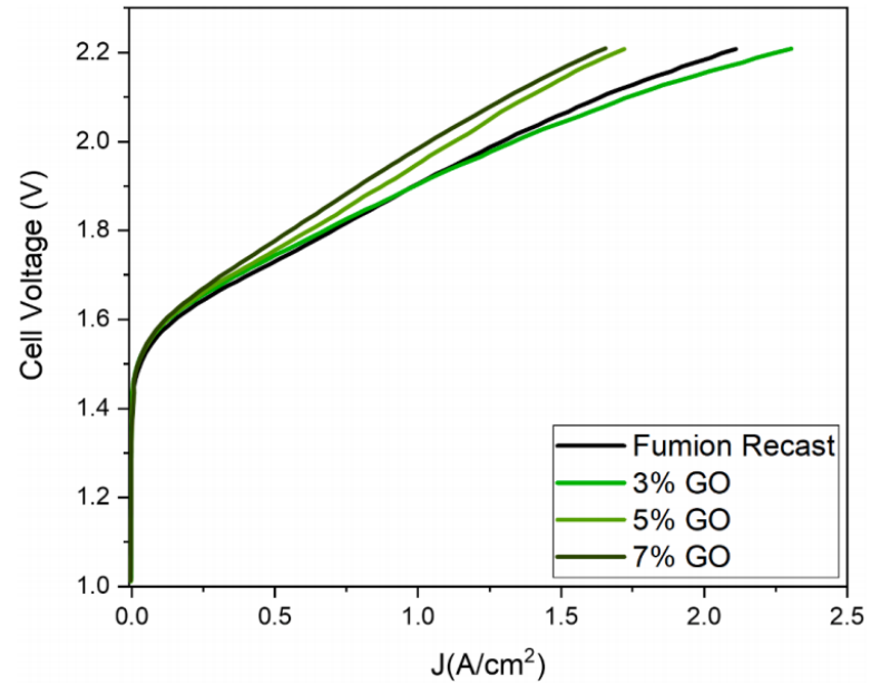 陰離子交換膜水電解槽(AEMWE)有望結(jié)合液體堿性電池和PEM技術(shù)的優(yōu)勢,提供更高純度的氫氣生產(chǎn),提高效率和動態(tài)性能。然而,AEM系統(tǒng)面臨著顯著的挑戰(zhàn),特別是在提高離子導(dǎo)電性和膜的穩(wěn)定性方面。特別是,AEMs的堿性化學(xué)穩(wěn)定性是最大的問題之一,因為它可以使用高堿性溶液作為電解質(zhì)。為了克服這些問題,在這項工作中,選擇的策略是在膜的聚合物基質(zhì)中簡單地添加無機填料。使用改進的Hummers方法合成了不同數(shù)量的氧化石墨烯(GO),并將其摻入基于Fumion的膜中。所得到的AEMs表現(xiàn)出更好的吸水性、化學(xué)穩(wěn)定性、熱穩(wěn)定性,并且在添加適量填料的情況下,電導(dǎo)率也有所提高。特別是,所有復(fù)合膜在80℃、6 M KOH中浸泡170 h后,失重和電化學(xué)損失都有所減少。在計時電流測試中,含有3%氧化石墨烯(wt%)的Fumion-GO AEM的電導(dǎo)率有所提高,在2 V和60℃下的電流密度高于1 A /cm