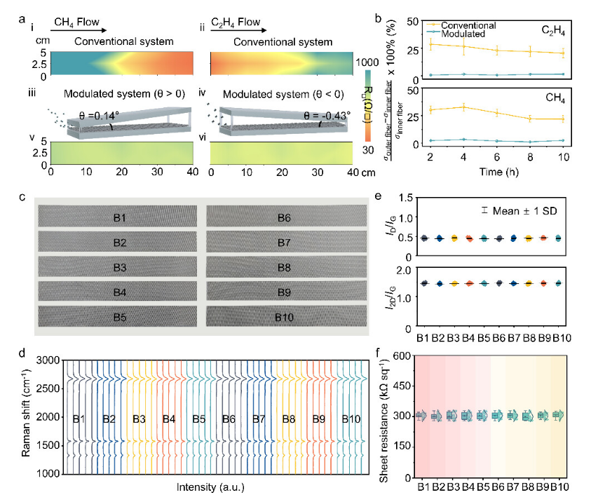 2 = 10/200 sccm,2-10 h。 (c) 從調制系統(tǒng)中生產的 10 個批次的 10 塊 GGFF(40 × 5 cm)的照片。 (d) 從(c)中樣品收集的拉曼光譜。 (e)(d)中拉曼表征中 I