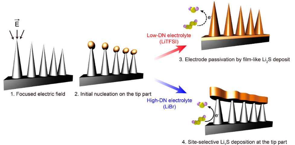 Fig 1. 由針狀電極和高供體數(shù) (DN) 陰離子實(shí)現(xiàn)的位點(diǎn)選擇性和形態(tài)控制 Li