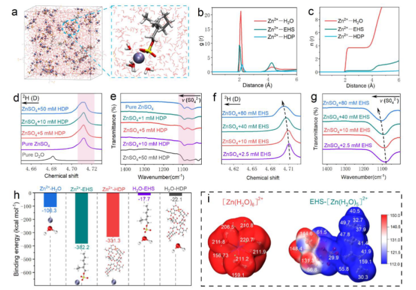 2+溶劑化結(jié)構(gòu)。b)在HCDISE的MD模擬中收集的RDF和c) Zn