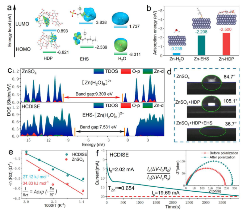 2O、Zn-EHS、Zn-HDP的吸附能。c)原始和EHS調(diào)節(jié)的水合離子結(jié)構(gòu)的部分態(tài)密度(PDOS)。d)不同電解質(zhì)接觸角試驗(yàn)。e)不同電解質(zhì)下的Arrhenius曲線和活化能。f) HCDISE的Zn