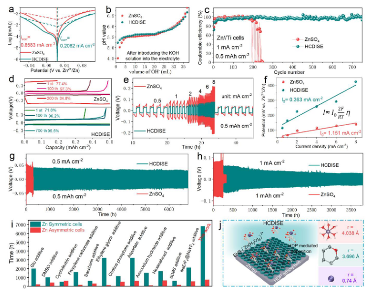 -2時剝離/鍍鋅的電壓-時間曲線比較i)本研究實(shí)現(xiàn)的循環(huán)可逆性與以往研究結(jié)果的比較。j) HCDISE中鍍鋅行為示意圖。