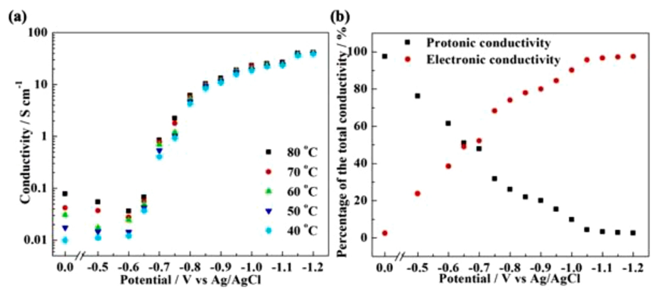 圖6. ERGO 的電導(dǎo)率:(a)不同溫度下 ERGO 的總電導(dǎo)率;(b)80 ℃ 時(shí) ERGO 的質(zhì)子和電子電導(dǎo)率百分比貢獻(xiàn)曲線(xiàn)。所有測(cè)量均在 100% RH 下進(jìn)行。