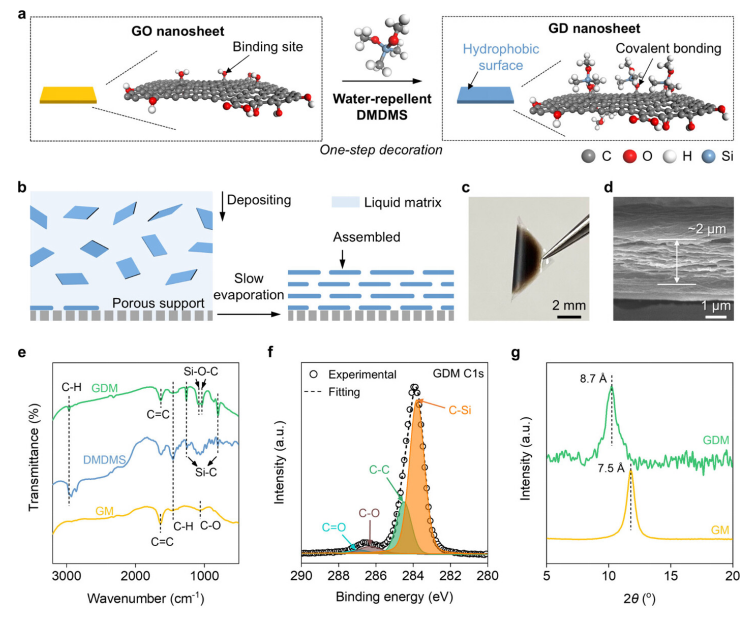 圖 1. GDM 的制造和表征。(a)一步修飾下在 GO 納米片表面接枝 DMDMS 分子合成 GD 納米片的示意圖。(b)組裝 GDM 的形成過程說明。(c)多孔 PET 支架支撐的 GDM 照片。(d)GDM 的 SEM 橫截面圖像。(e)GM、液態(tài) DMDMS 和 GDM 的 FTIR 光譜。(f)GDM 的 XPS C 1s 光譜。(g)GM 和 GDM 的 XRD 圖案。