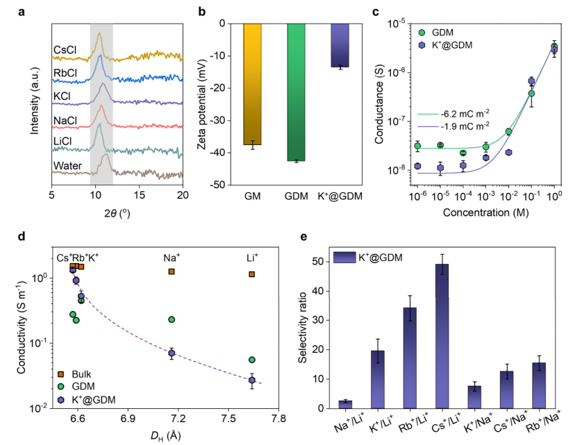 圖3. 電荷屏蔽 K+@GDM 的離子傳輸性能。 (a) 浸入 0.1 M LiCl、NaCl、KCl、RbCl 和 CsCl 和純水中后的 K+@GDM 的 XRD 圖案。 (b) 通過電泳光散射 (ELS) 測(cè)量在中性 pH 下 GM、GDM 和 K+@GDM 的 Zeta 電位。 (c) 在不同濃度 KCl 溶液下由 GDM 和 K+@GDM 制成的埃級(jí)通道的電導(dǎo)率。 為了區(qū)分,Rb+ (6.58 Å) 和 Cs+ (6.58 Å) 的 DH 分別繪制為 6.59 和 6.57 Å。 實(shí)線由支持信息中詳述的空間擴(kuò)展表面?zhèn)鲗?dǎo)模型擬合。 (d) 0.1 M 氯化物溶液下 GDM 和 K+@GDM 的電導(dǎo)率。 實(shí)心方塊表示鹽的體積電導(dǎo)率。 紫色虛線是引導(dǎo)眼睛的。 (e)K+@GDM 的選擇性比率。誤差線來自三個(gè)獨(dú)立樣本。