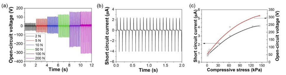圖 6. 力幅對(duì)開(kāi)路電壓和短路電流輸出的影響:(a)2、5、10、50、100 和 200 N 下的電壓輸出;(b)200 N 下的短路電流;(c)電壓和電流輸出與壓力的關(guān)系。