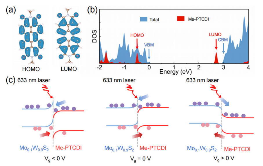 圖3. 二維有機/無機異質(zhì)結(jié)構(gòu)的理論建模與柵極調(diào)諧。a) Me-PTCDI分子HOMO和LUMO的電荷密度圖;b)用GW法計算Me-PTCDI/Mo