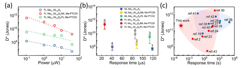 圖4. 不同結(jié)構(gòu)和層厚的探測率和響應時間。a)在不同Me-PTCDI厚度下,光電探測器的探測率隨光功率的增加而降低。與沒有Me-PTCDI相比,厚Me-PTCDI層和ML Me-PTCDI/FL Mo