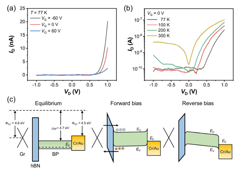 圖3. BP/hBN/Gr MIS二極管機(jī)構(gòu)。(a) MIS器件的輸出曲線作為柵極偏置的函數(shù)。(b) 在不施加?xùn)艠O偏置的情況下MIS二極管特性的溫度依賴性。(c) 解釋MIS二極管機(jī)理的帶示意圖。