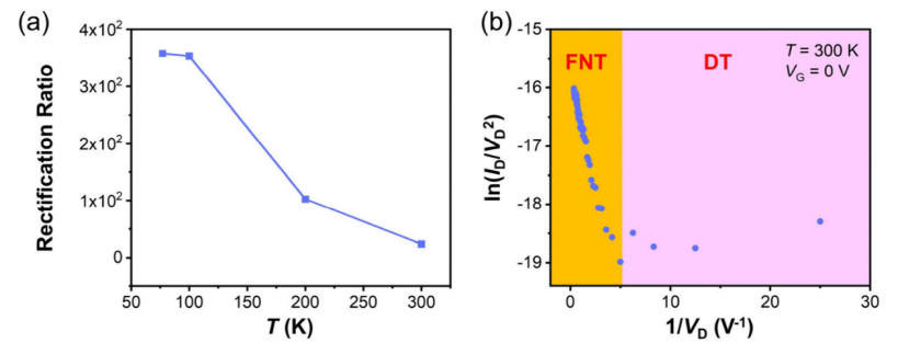 圖4. (a) 裝置在不同溫度下的精餾比。(b) MIS二極管的隧穿機(jī)制。