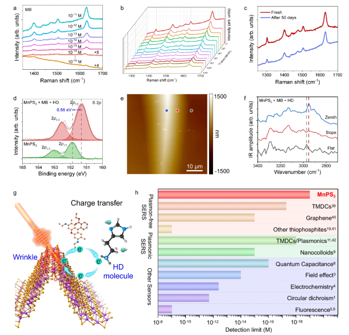 3的S 2p XPS光譜。e含有MB和HD分子的二維MnPS3皺褶的AFM圖像,選擇其中三個位置收集(f)納米紅外光譜。g機械化學SERS平臺工作機理示意圖。h基于MnPS