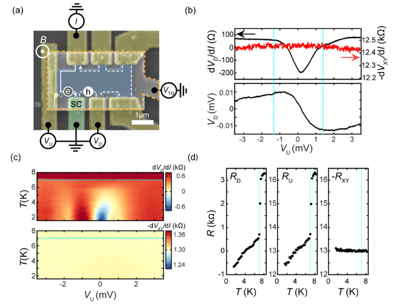 圖4. 負(fù)填充因子ν=−2的量子霍爾態(tài)中的交叉Andreev轉(zhuǎn)換。(a) 石墨烯霍爾棒器件的假彩色掃描電子顯微鏡圖像,該器件由具有測量結(jié)構(gòu)的二維(2D)超導(dǎo)鉬/錸(MoRe)觸點制成。更超導(dǎo)的電極(綠色)和Au/Cr正常電極(黃色)與石墨烯(藍(lán)色)接觸。橙色虛線表示頂部柵極。(b) 上面板:在磁場B=4.559 T、背柵極電壓V