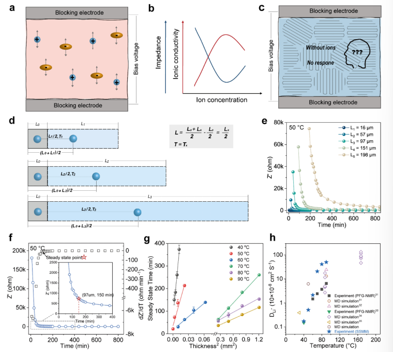 圖2. 用穩(wěn)態(tài)測量法定量化自適應(yīng)離子擴散系數(shù)。(a)電化學(xué)阻抗譜中的離子響應(yīng)示意圖。(b)電解質(zhì)的阻抗和離子電導(dǎo)率作為離子濃度的函數(shù)。(c)說明電化學(xué)阻抗譜在無離子體系中的局限性的示意圖。(d)穩(wěn)態(tài)測量方法示意圖。(e)不同體積PEO厚度的電化學(xué)阻抗隨時間變化。