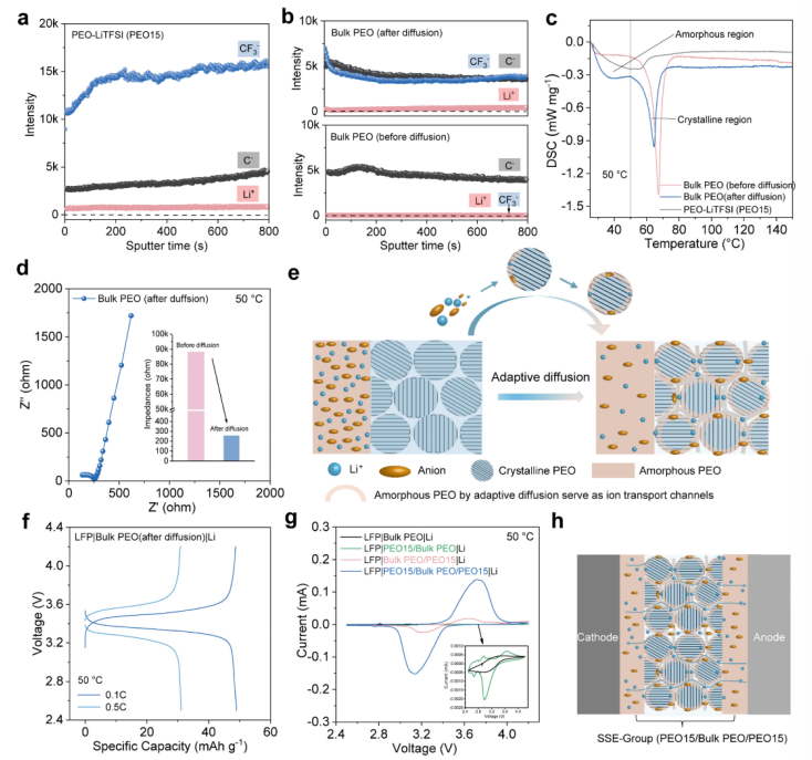 +區(qū)(PEO15)和大塊PEO區(qū)的DSC曲線。(d) 自適應(yīng)擴散前后PEO塊體區(qū)域的EIS。(e) 自適應(yīng)擴散過程中提出的離子傳輸機制示意圖。(f) 含擴散體PEO的LFP | Li電池的電壓分布。(g) LFP基固態(tài)電池在不同構(gòu)型(LFP | Bulk PEO | Li;LFP | PEO15/Bulk PEO | Li;LFP | Bulk PEO/PEO15 | Li;LFP | PEO15/Bulk PEO/PEO15 | Li)下的CV曲線。(h) SSE基團構(gòu)型和離子傳輸機制示意圖。