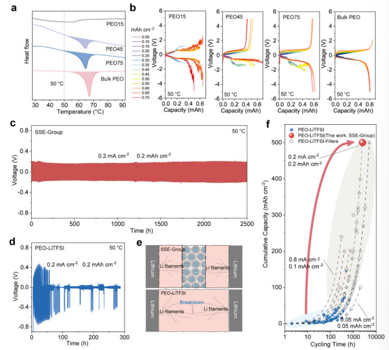 3+等離子。我們開發(fā)了一種穩(wěn)態(tài)測量方法(SSMM),該方法克服了傳統(tǒng)電化學(xué)阻抗譜的局限性,能夠在不同溫度下精確量化塊體PEO的自適應(yīng)擴散系數(shù)。物理化學(xué)和電化學(xué)表征表明,在保持高結(jié)晶度的同時,塊狀PEO通過自適應(yīng)離子擴散形成連續(xù)的離子傳輸通道?;谶@些特性,我們提出了一種使用高結(jié)晶體PEO作為中間層的固態(tài)電解質(zhì)組(SSE-Group),而不添加填料。這種SSE-Group結(jié)構(gòu)抑制了鋰絲生長引起的軟擊穿,提高了對稱鋰電池在0.2 mA cm