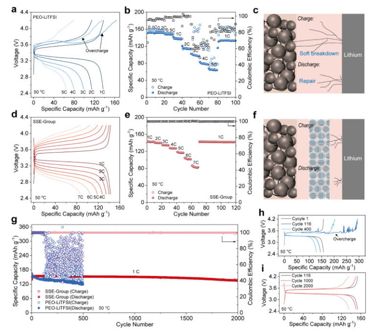 圖5. LFP基固態(tài)電池的電化學(xué)性能。(a) 充放電曲線,(b)速率性能,(c)傳統(tǒng)PEO-LiTFSI電解液的鋰絲穿透示意圖。(d) 充放電曲線,(e)速率性能,(f)SSE組抑制鋰燈絲穿透的示意圖。(g) 采用傳統(tǒng)PEO-LiTFSI電解質(zhì)和SSE組的LFP基固態(tài)電池的循環(huán)性能。(h)傳統(tǒng)PEO-LiTFSI電解質(zhì)和(i)SSE組在不同循環(huán)下的充放電曲線。
