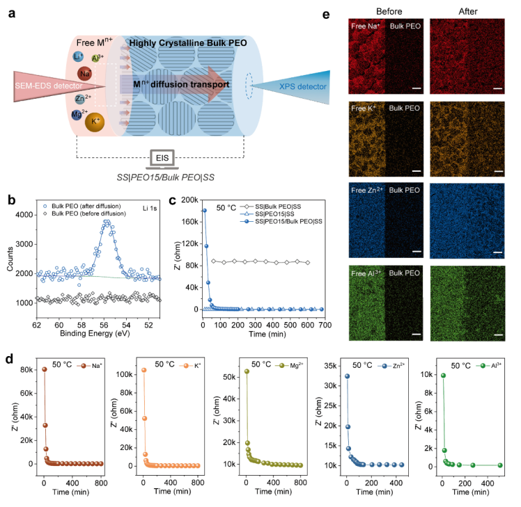 +區(qū)(PEO15)和組合組(PEO15/散裝PEO)的電化學(xué)阻抗隨時間的變化。(d)不同離子(Na