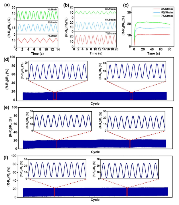 Fig 4. CA-rGSFS 縫合線的機(jī)電性能。在 (a) 干燥和 (b) 潮濕環(huán)境中,縫合線在應(yīng)變水平為 3%、5% 和 7% 以及頻率為 0.1 Hz 時(shí)的動(dòng)態(tài)穩(wěn)定性;(c) 縫合線在應(yīng)變水平為 3%、5% 和 7% 時(shí)的靜態(tài)穩(wěn)定性。在施加 3% 循環(huán)應(yīng)變、頻率為 0.1 Hz 和 3000 次循環(huán)的情況下,(d) CA-rGSFS4、(e) CA-rGSFS6 和 (f) CA-rGSFS8 的電響應(yīng)。