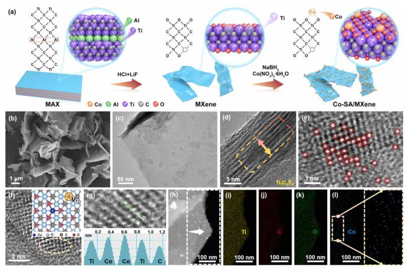 Fig 1. (a) Co-SA/MXene 的合成示意圖。(b) Co-SA/MXene 的掃描電子顯微鏡(SEM)圖像,(c) 和 (d) 高分辨率透射電子顯微鏡(HRTEM)圖像。(e)和(f)選區(qū)電子衍射(SAED)圖案和優(yōu)化結(jié)構(gòu)(圖 1f 插圖),以及(g)Co-SA/MXene 的代表性強(qiáng)度曲線。(h) Co-SA/MXene 的能量色散 X 射線映射,包括 (i)Ti、(j)C、(k)O 和 (l)Co。
