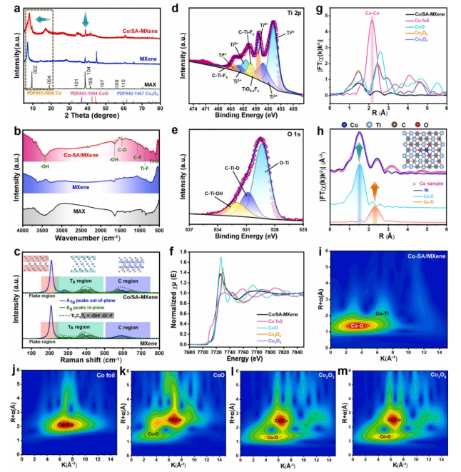 2-based MXene 和 Co-SA/MXene 的拉曼光譜。Co-SA/MXene 的 (d) Ti 2p,(e) O 1 s XPS 光譜。 (f) Co-SA/MXene 和對(duì)照樣的 Co K-edge 的歸一化 XANES 光譜。(g) Co-SA/MXene 和對(duì)照樣的 Co K-edge FT-EXAFS 光譜。(h) R 空間中 Co-SA/MXene 的 Co K-edge EXAFS 擬合曲線(插圖:Co-SA/MXene 的可能結(jié)構(gòu)),以及 Co-SA/MXene 的 FT-EXAFS 光譜的第一、二殼(O、Ti)擬合結(jié)果。(i) Co-SA/MXene、(j) Co 箔、(k) CoO、(l) Co