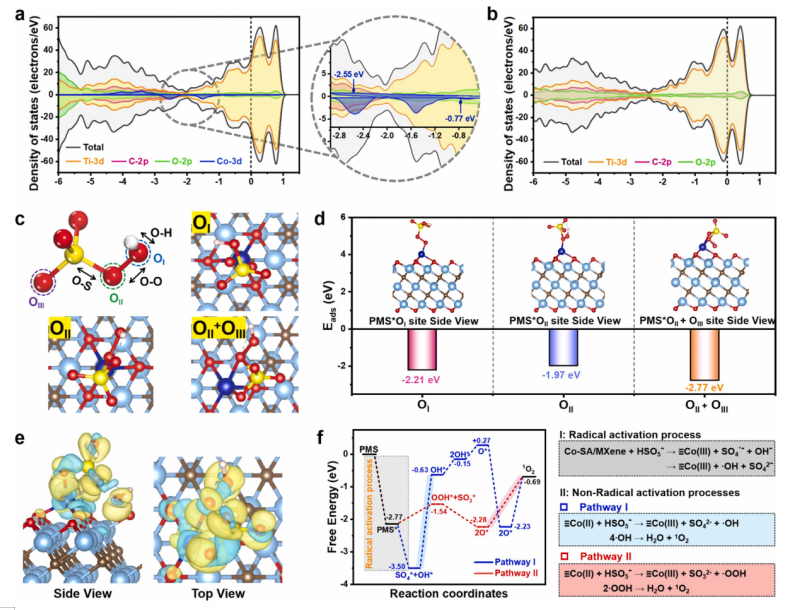 2基 MXene 的 PDOS。(c) PMS 分子的理論結(jié)構(gòu)模型及其在 Co-SA/MXene 上的三種優(yōu)化吸附構(gòu)型。(d) PMS 分子在 Co-SA/MXene 上通過(guò)分子結(jié)構(gòu)中不同 O 原子(即 O、O