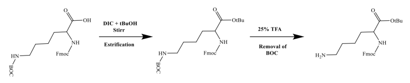 流程圖1. 利用叔丁基 (OtBu) 基團(tuán)通過(guò)酯化作用保護(hù) Fmoc-Lys(BOC)–OH 的游離羧酸,然后從 ε-胺中去除 BOC 基團(tuán)。