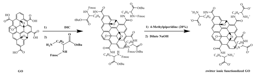 流程圖 2. 受保護(hù)的賴氨酸的 ε-胺與 GO(由 DIC 活化)進(jìn)行酰胺偶聯(lián),然后去除 Fmoc 和 OtBu 基團(tuán)以形成 GO-Lys。