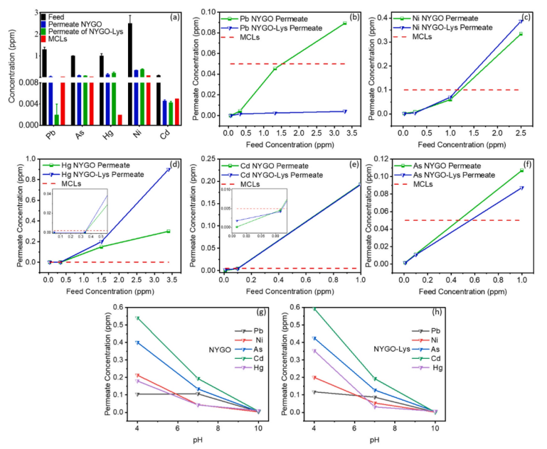 圖4. a:與MCLs相比,飼料中的金屬污染物以及NYGO和NYGO- Lys膜的滲透物的ICPMS數(shù)據(jù)。(b-f):表示NYGO和NYGO- Lys復(fù)合膜滲透液中Pb、Ni、Hg、Cd和As的殘留濃度隨進(jìn)料濃度的變化趨勢(shì),ERL位于趨勢(shì)線與MCLs的交點(diǎn)。(g和h) pH影響NYGO和NYGO- Lys復(fù)合膜在恒定進(jìn)料濃度下保留金屬的能力,即所有進(jìn)料濃度均為1ppm。