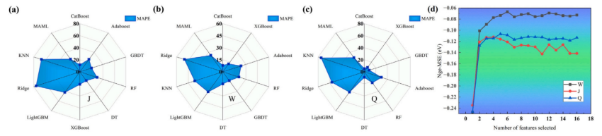 圖3. (a) 鋁基體 (b) 石墨烯/鋁完美界面和 (c) 石墨烯/鋁缺陷界面的平均絕對百分比誤差重要性雷達圖。(d) 特征去除曲線。