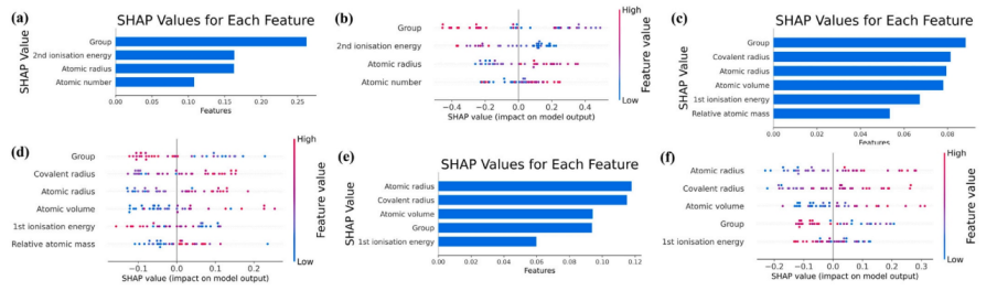 圖5. (a) 鋁基質(zhì) (c) 石墨烯/鋁復(fù)合材料完美界面和 (e) 石墨烯/鋁復(fù)合材料缺陷界面的 SHAP 值,(b) 鋁基質(zhì) (d) 石墨烯/鋁復(fù)合材料完美界面和 (f) 石墨烯/鋁復(fù)合材料缺陷界面的 SHAP 摘要圖表。