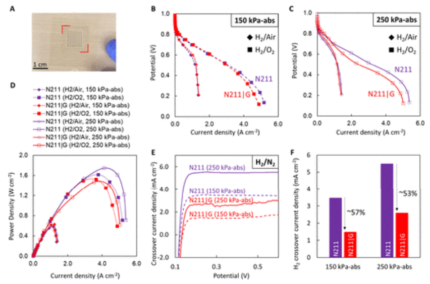 2燃料電池中運(yùn)行的性能。(A) N211 | G樣品在涂上催化劑墨水之前的圖像,石墨烯角用紅線表示。N211和N211 | G膜的有效面積(由Kapton窗口定義)為∼1 cm
