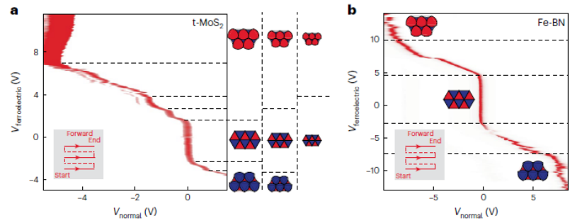 圖 4. 鐵電階梯。a、在多層扭曲 MoS2 器件的相圖中觀察到的多個庫侖屏蔽階梯。附有極性疇網絡層分辨切換的示意圖,其中較小的疇需要較高的切換場。b、典型的 BN-石墨烯異質結構的相圖,其中較少的階梯表示極性疇的分布更均勻。插圖:柵極掃描配置。請注意,這里在不同類型的器件中使用統(tǒng)一的 Vferroelectric 和 Vnormal 標記,分別代表有和沒有磁滯回線的柵極。